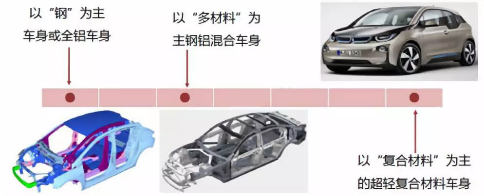 車用復合材料的發展結合了化工、機械制造和汽車復合材料設計等多學科的技術,集中應用在汽車底盤、車身覆蓋件和次結構部件三個領域。其中碳纖維復合材料車身是最具顛覆性的輕量化路徑。
