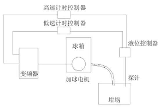 2.1.1.3加球控制 在目前的生產中,坩堝拉絲工藝的間斷式加球控制是在正常生產中影響溫度最主要的因素之一。而周期式加球控制就會打破系統中溫度的平衡狀態,導致系統內的溫度平衡被一次次打破而又一次次被重新調節,使得系統內的溫度波動幅度較大,溫度精度很難控制。關于怎樣解決和改善間斷加球所出現的問題,成為連續加球是改善和提高系統穩定性的另一個重要的一面。因為如果池窯液體控制這種方式花費較多,在日常的生產生活中得不到推廣,所以人們經過努力創新,提出了一種新的方法,在探針測液面的前提下,將加球方式改為連續非勻速加球。,就可以克服原系統的弊端。在拉絲時,為了降低爐內的氣溫波動,改變探針和液面的接觸狀態來調節加球的速度。通過輸出計的報警保護,確保加球的過程安全可靠。準確合適的高低速調節能夠確保液體保持很小的波動。通過這些改造,保證了這個系統在恒壓、恒流的控制方式之下也能夠使得高支紗支數波動在很小的范圍之內。